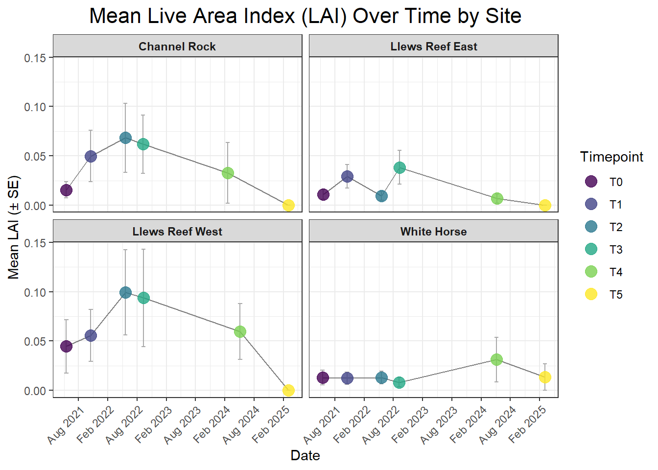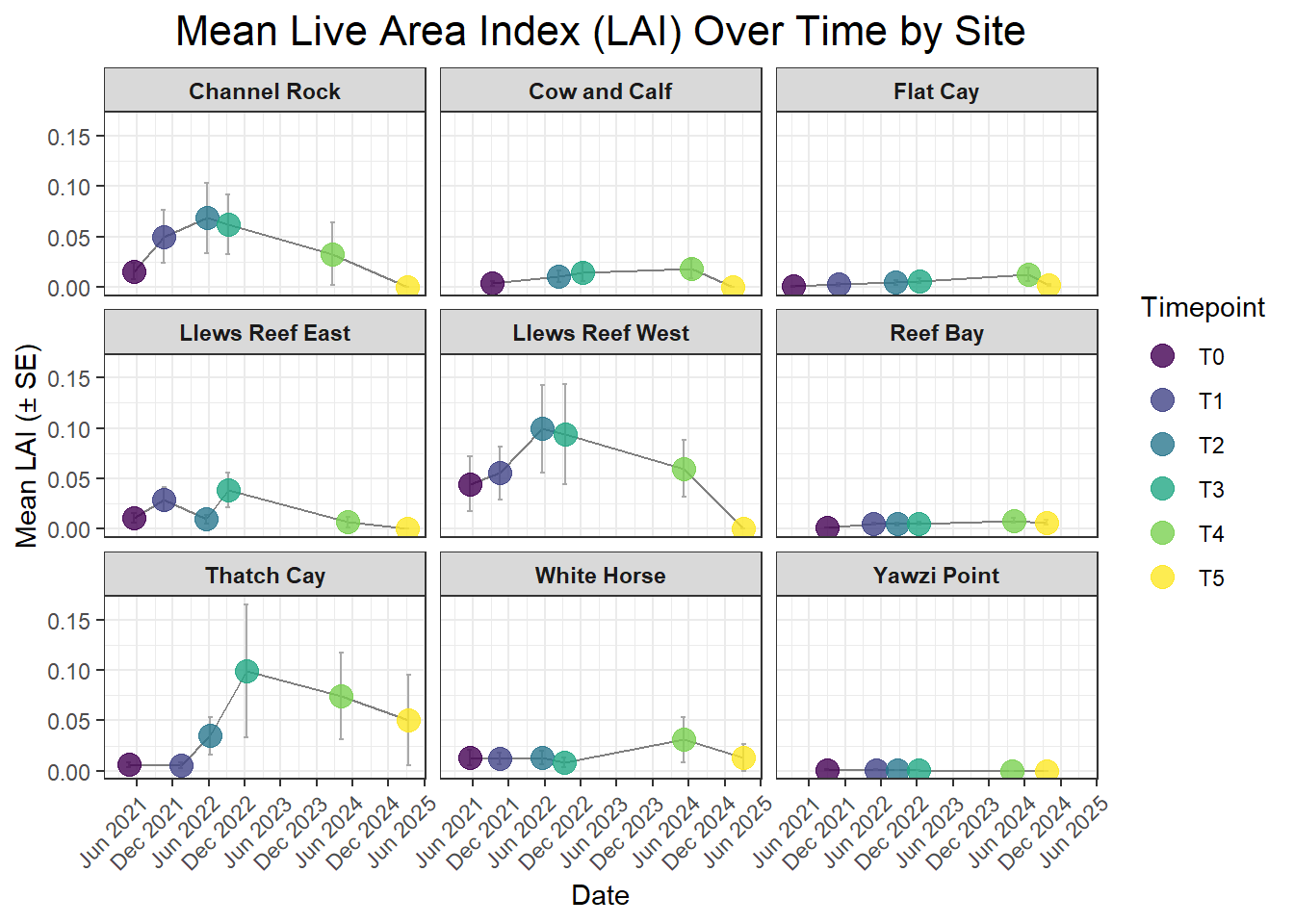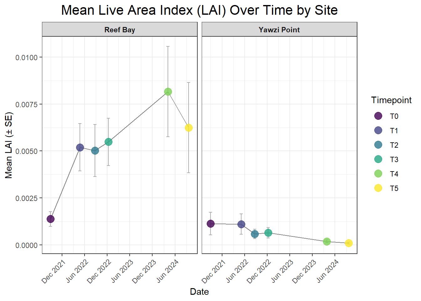 A 3-dimensional metric that approximates the total live, photosynthetically-active surface area of a coral colony. Unlike 2D “percent cover” which just measures the area a coral occupies on the seafloor, LAI accounts for the complex, branching structure of species like Acropora. It’s calculated by combining the colony’s structural volume (from length, width, and height) with its live tissue percentage. Tracking LAI provides a much more comprehensive measure of health; a high LAI suggests a large, complex, and healthy colony, while a decreasing LAI can signal tissue loss, disease, or partial mortality, even if the colony’s 2D footprint remains the same.