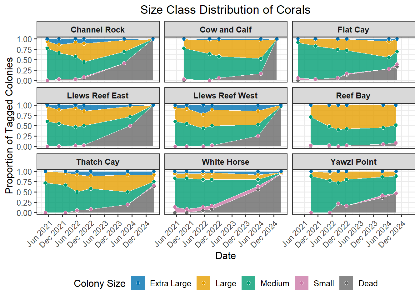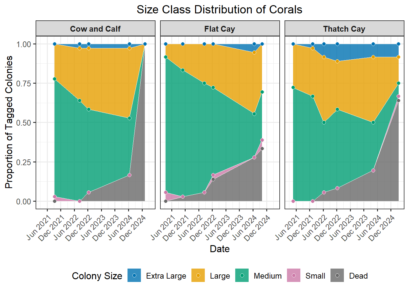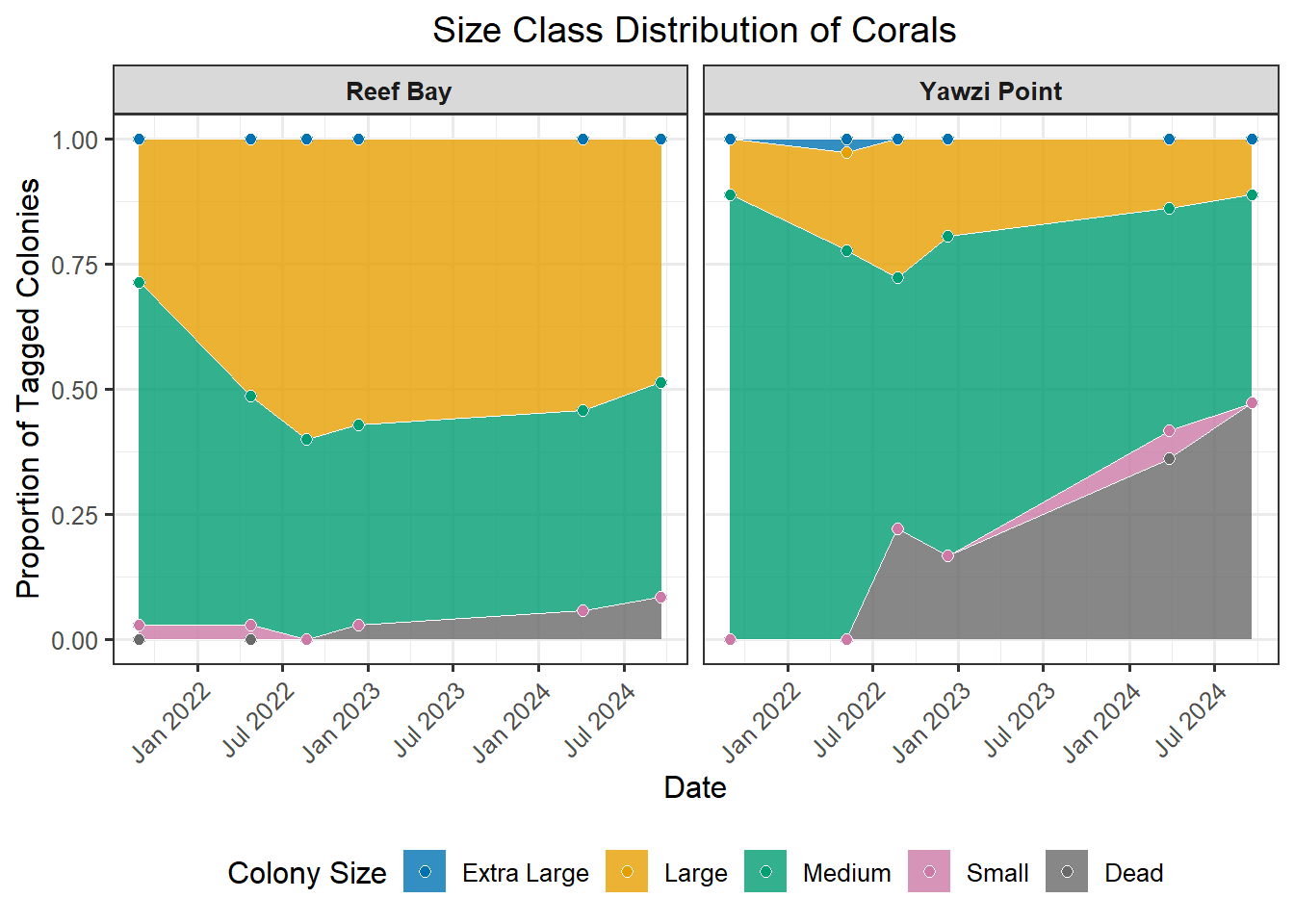 A powerful demographic view of the coral population, revealing its underlying structure and how it changes over time. This method involves categorizing each coral colony into a specific size “bin” based on its 3D structural volume (Structure = L x W x H). The resulting stacked plot shows the proportion of the population in each class, from “Dead” (Bin_0) and “Small” (Bin_1) up to “Extra Large” (Bin_4). Watching these proportions shift is crucial; for instance, a growing number of “Small” colonies could signal successful recruitment, while a loss of “Large” colonies might indicate high mortality on the most established corals, significantly impacting the reef’s overall complexity and resilience.