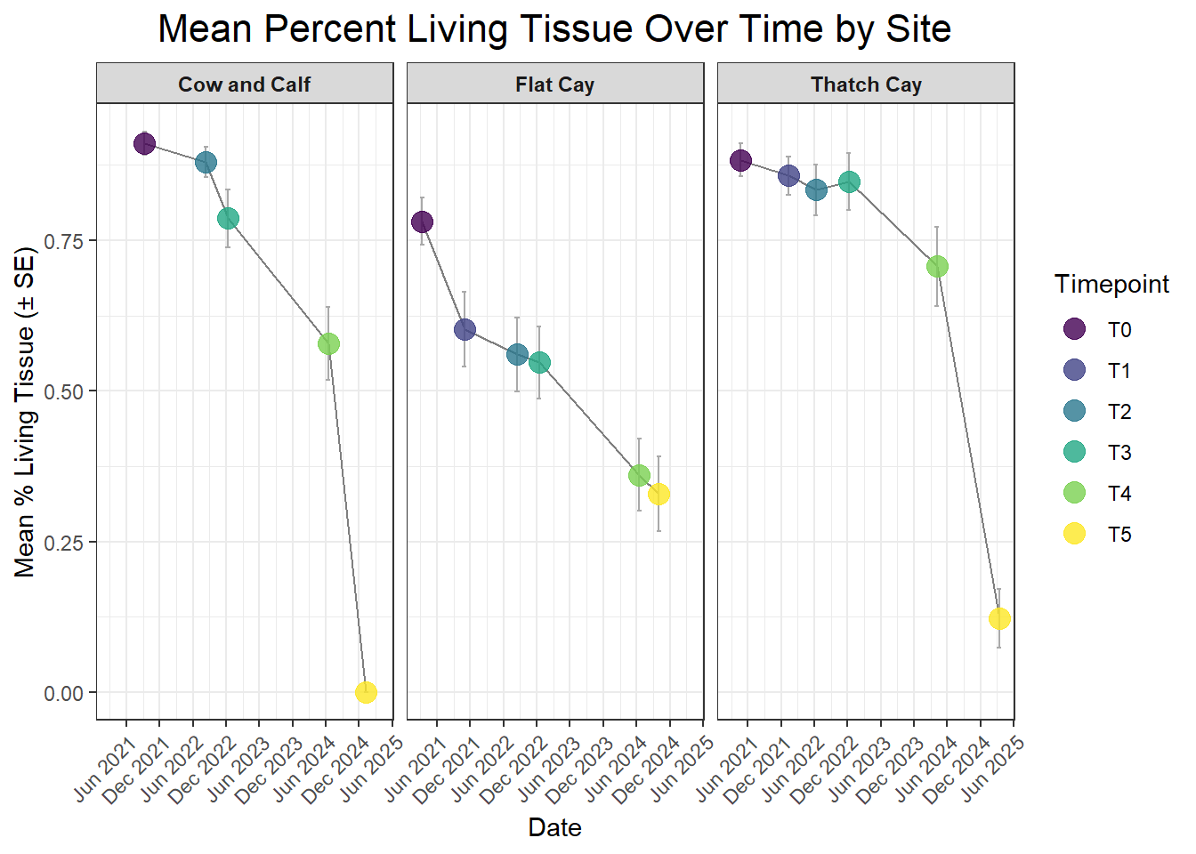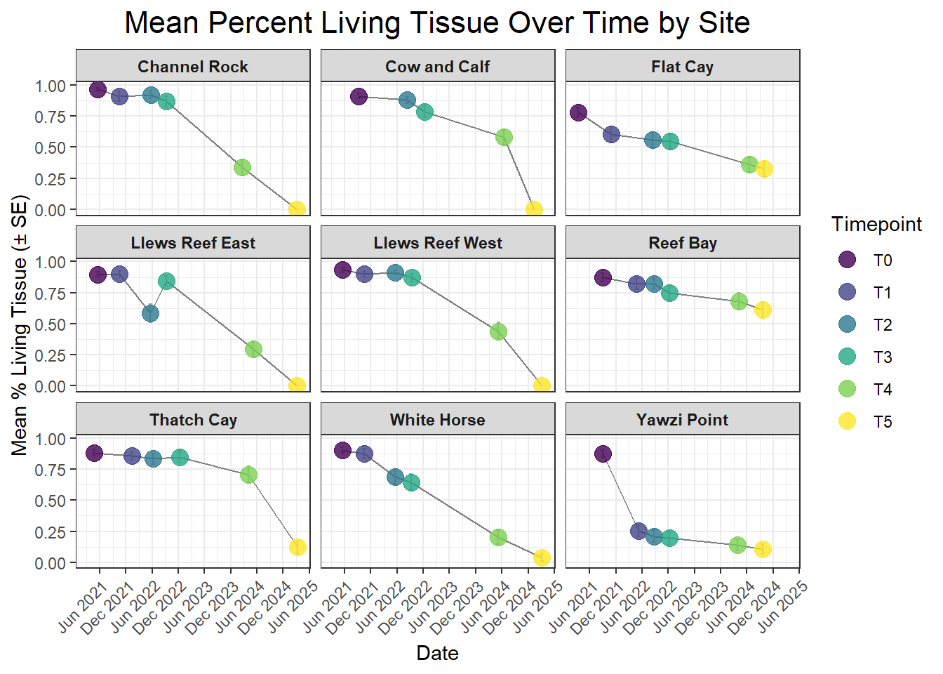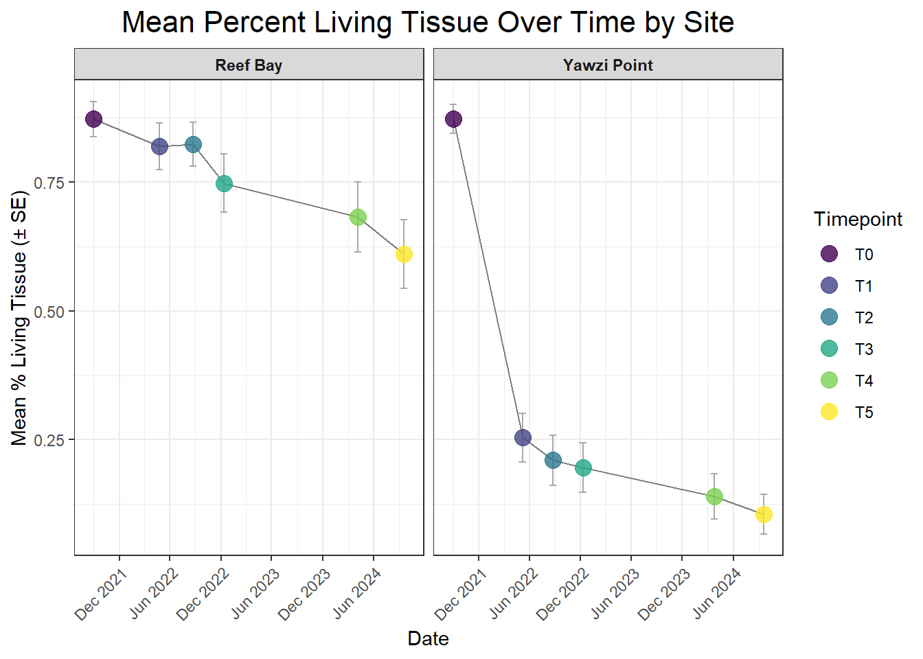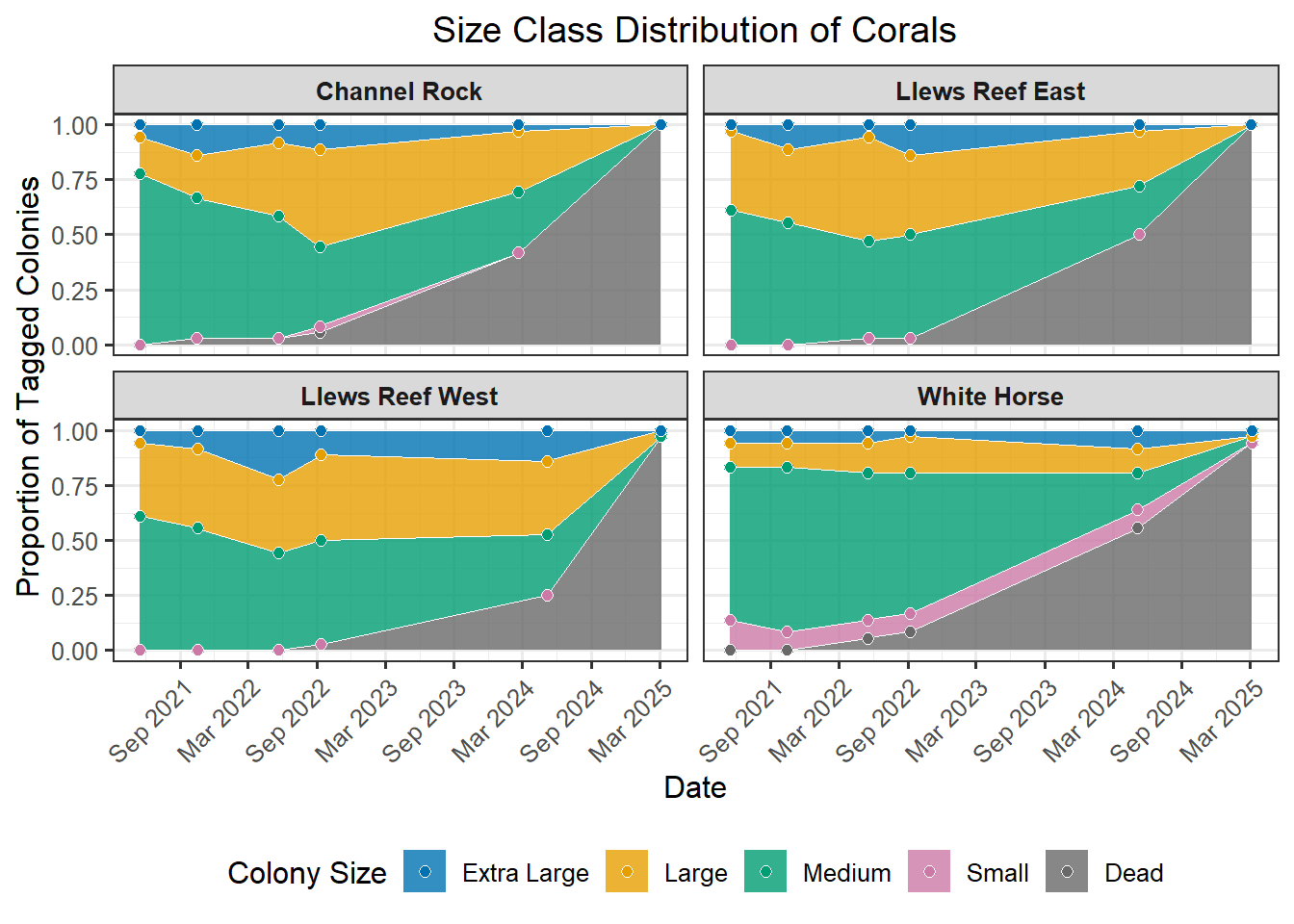 A powerful demographic view of the coral population, revealing its underlying structure and how it changes over time. This method involves categorizing each coral colony into a specific size “bin” based on its 3D structural volume (Structure = L x W x H). The resulting stacked plot shows the proportion of the population in each class, from “Dead” (Bin_0) and “Small” (Bin_1) up to “Extra Large” (Bin_4). Watching these proportions shift is crucial; for instance, a growing number of “Small” colonies could signal successful recruitment, while a loss of “Large” colonies might indicate high mortality on the most established corals, significantly impacting the reef’s overall complexity and resilience.
